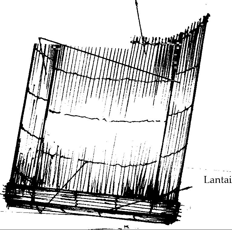 Manakala di bahagian bawah dilekatkan pula sekeping lantai melintang yang sama panjang dengan lebar lantai tadi, dibentuk separuh melengkung yang diletakkan (diikat) pada bahagian dinding (lantai) ‘pelompat’ tersebut.