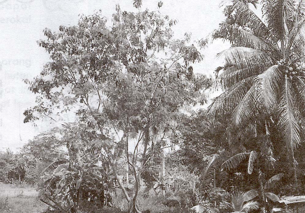 Pokok petai belalang yang buahnya sudah masak. Di sebelahnya pokok kelapa