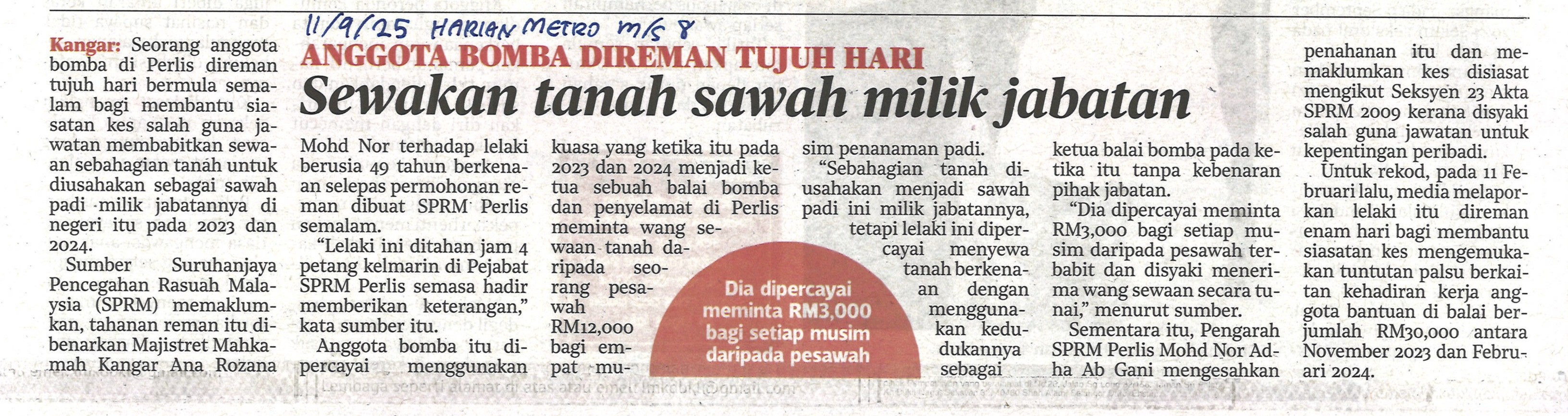ANGGOTA BOMBA DIREMAN TUJUH HARI, Sewakan tanah sawah milik jabatan
