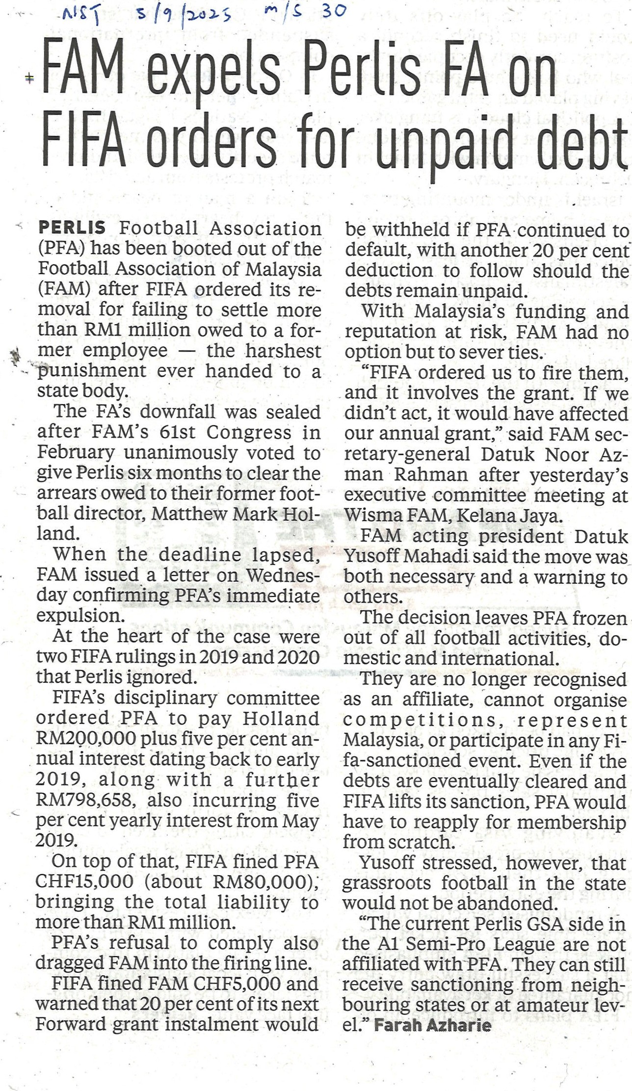 FAM expels Perlis FA on FIFA orders for unpaid debt