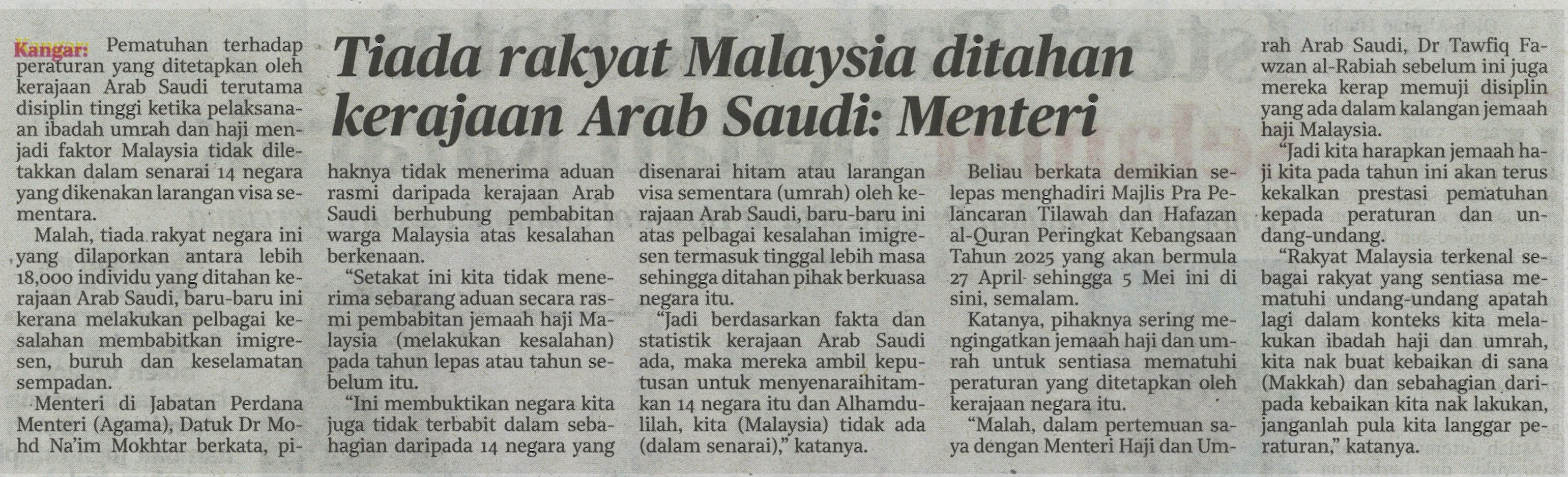 Tiada rakyat Malaysia ditahan kerajaan Arab saudi: Menteri