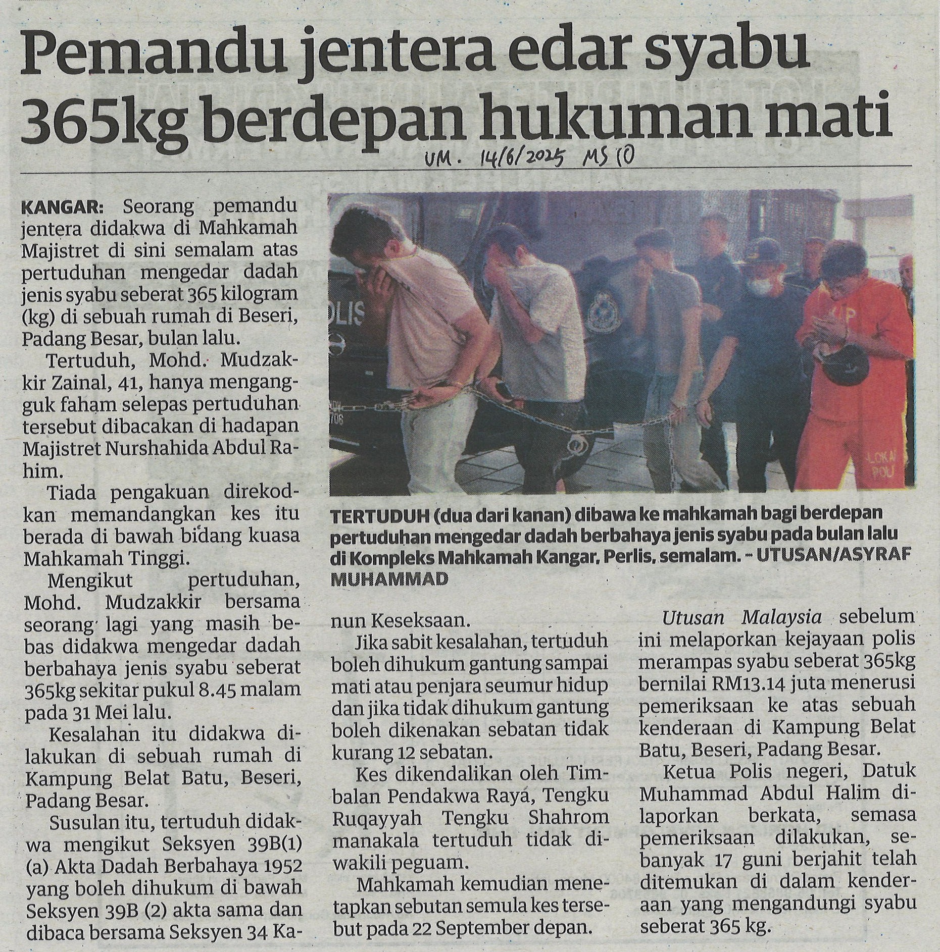 Pemandu jentera edar syabu 365kg berdepan hukuman mati