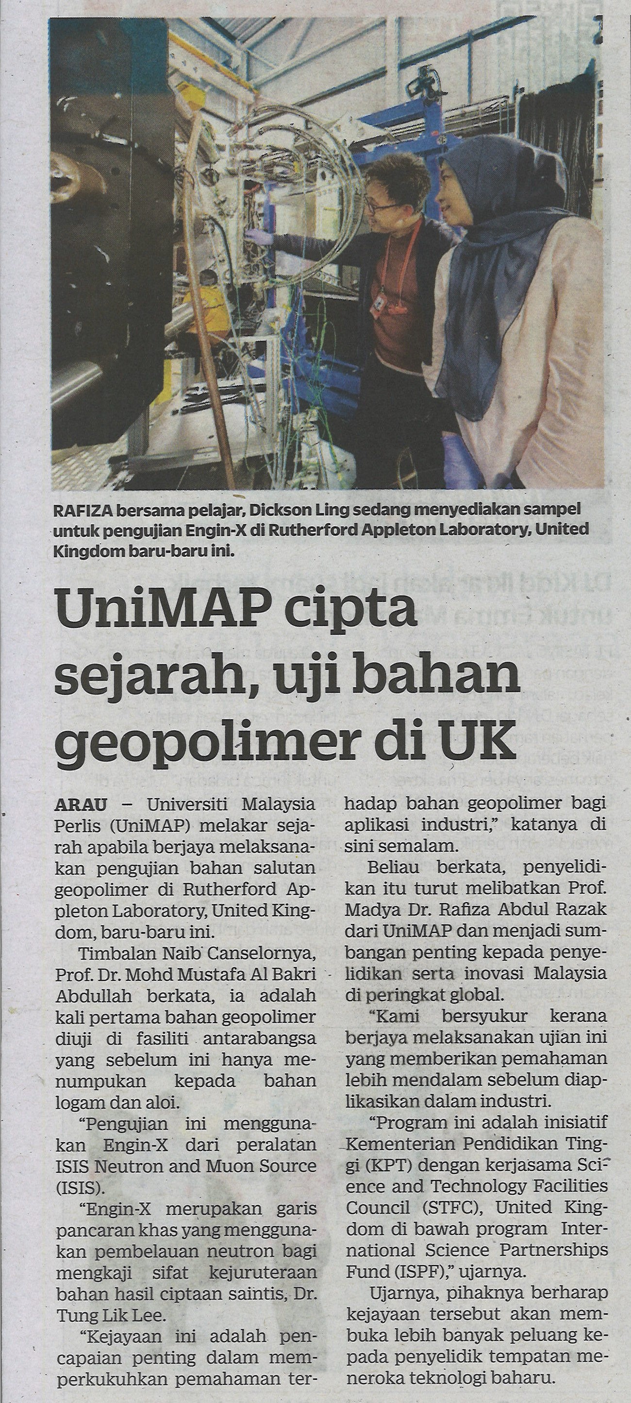 UniMAP cipta sejarah, uji bahan geopolimer di UK