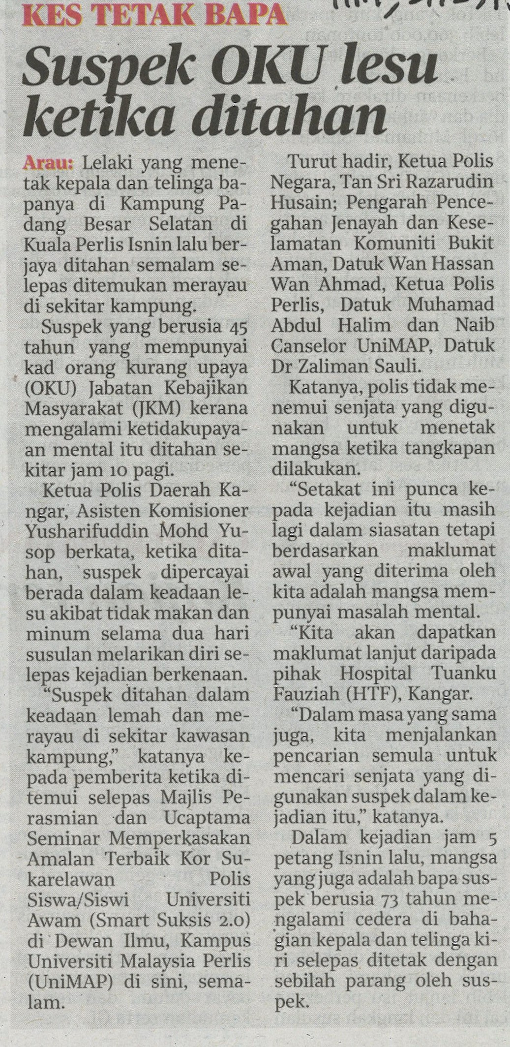 KES TETAK BAPA Suspek OKU lesu ketika ditahan