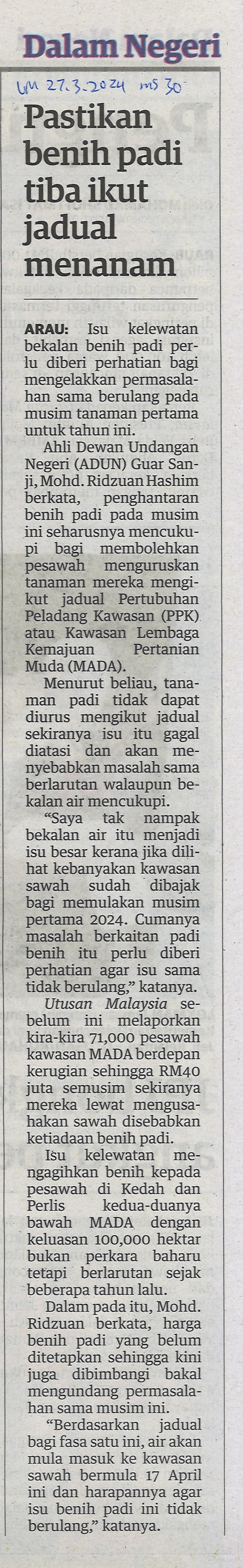Pastikan benih padi tiba ikut jadual menanam