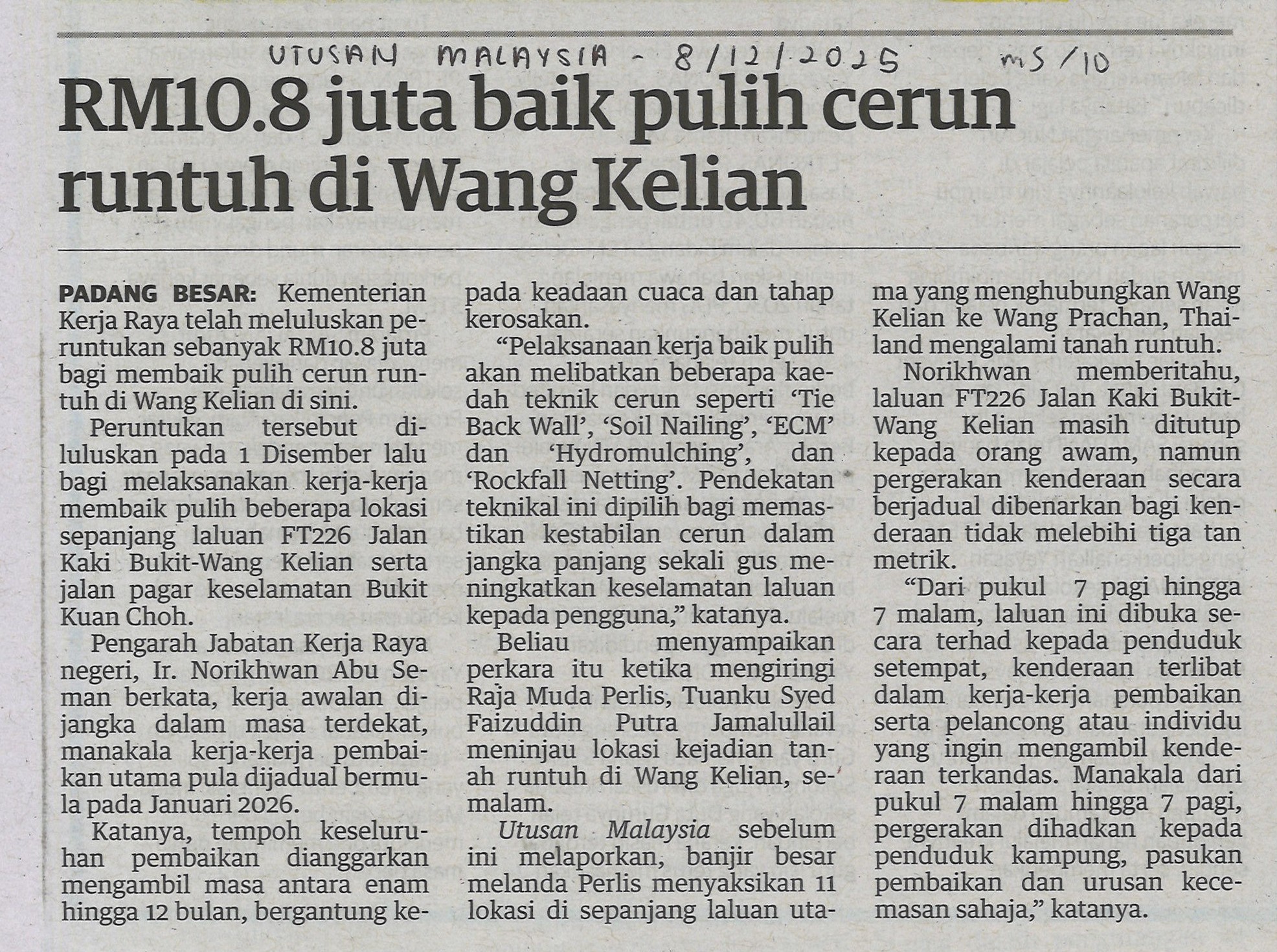 RM10.8 juta baik putih cerun runtuh di Wang Kelian.
