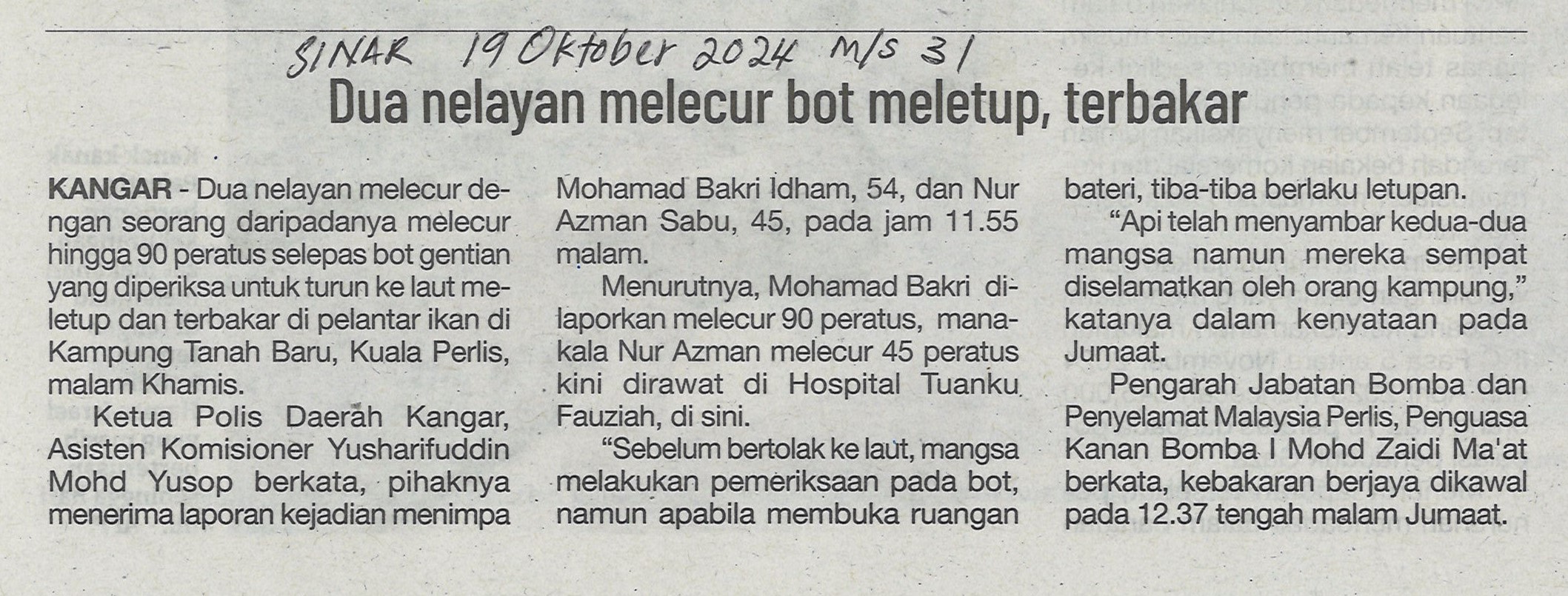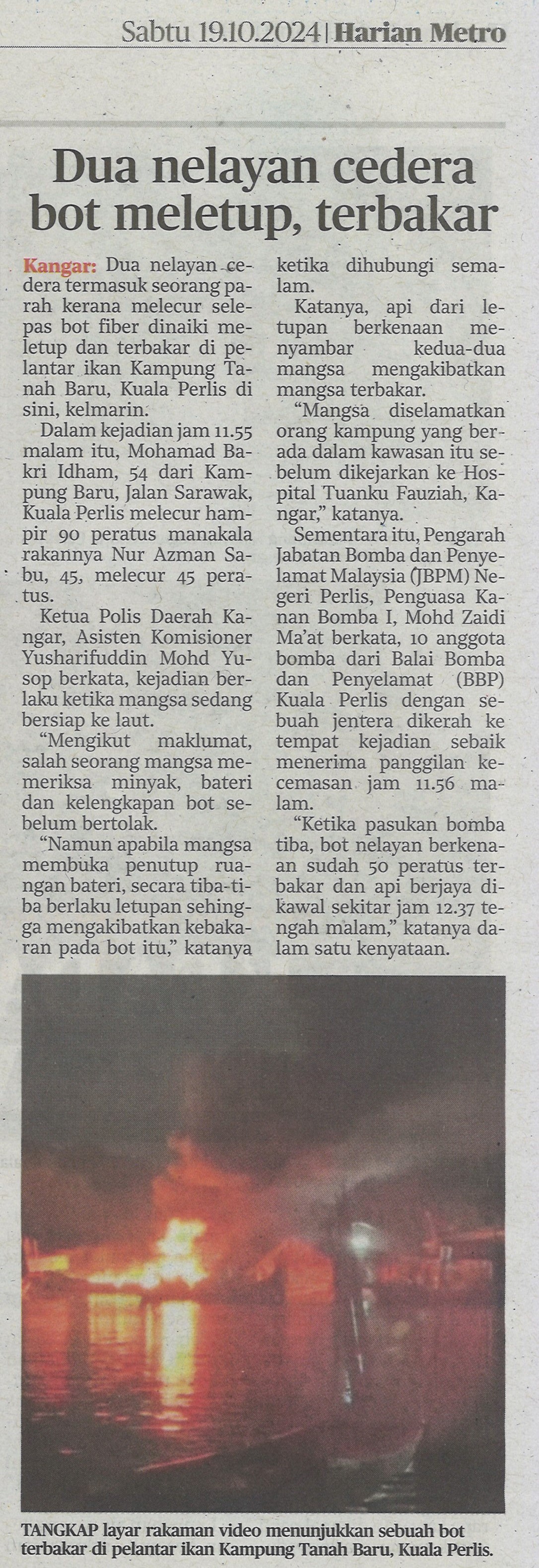 Dua nelayan cedera bot meletup, terbakar
