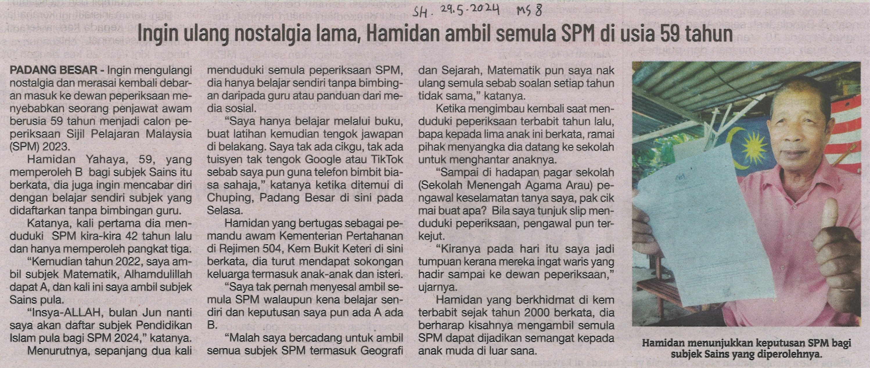 Ingin ulang nostalgia lama, Hamidan ambil semula SPM di usia 59 tahun