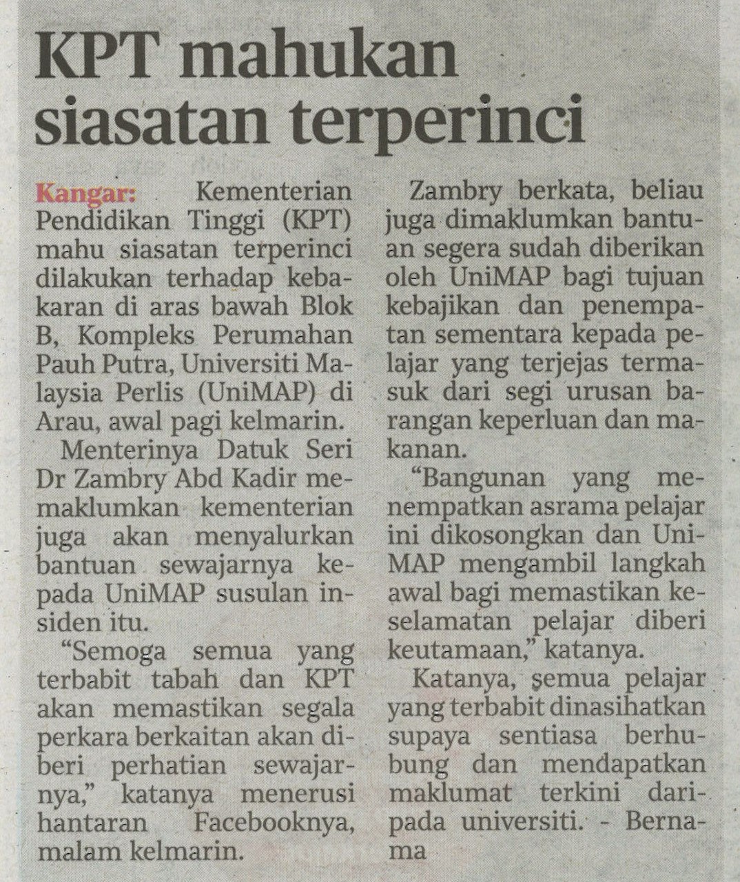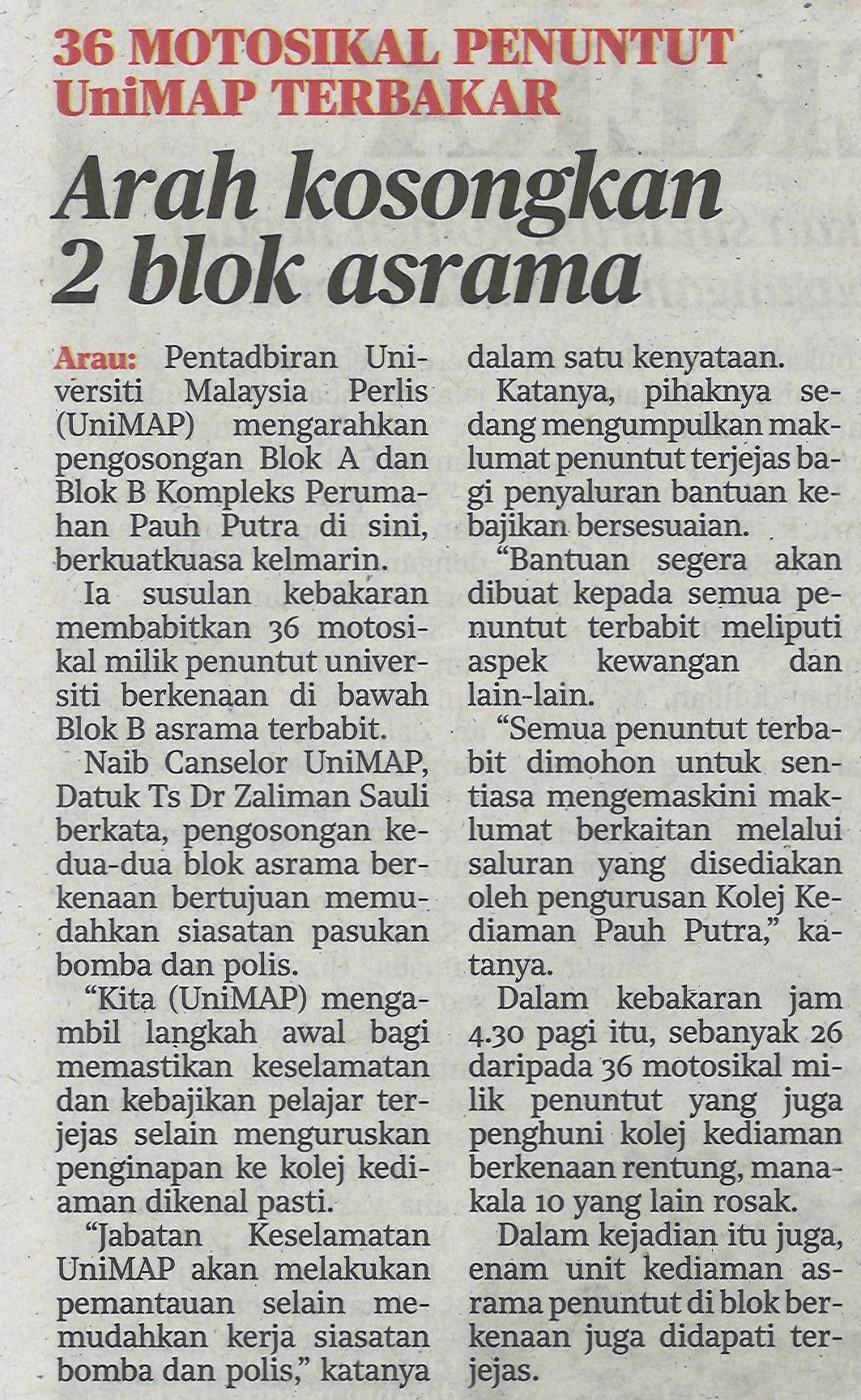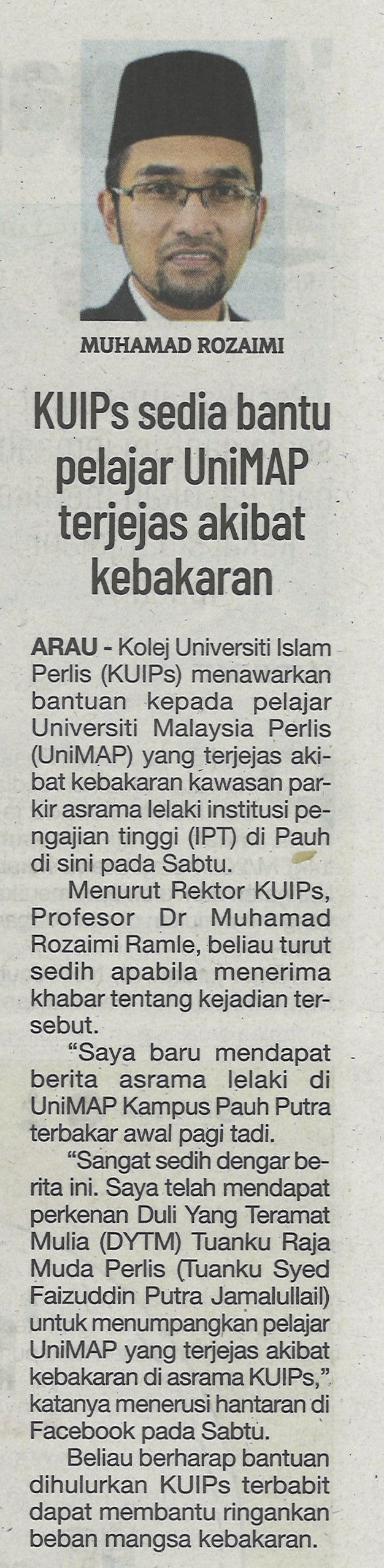 KUIPs sedia bantu pelajar UniMAP terjejas akibat kebakaran