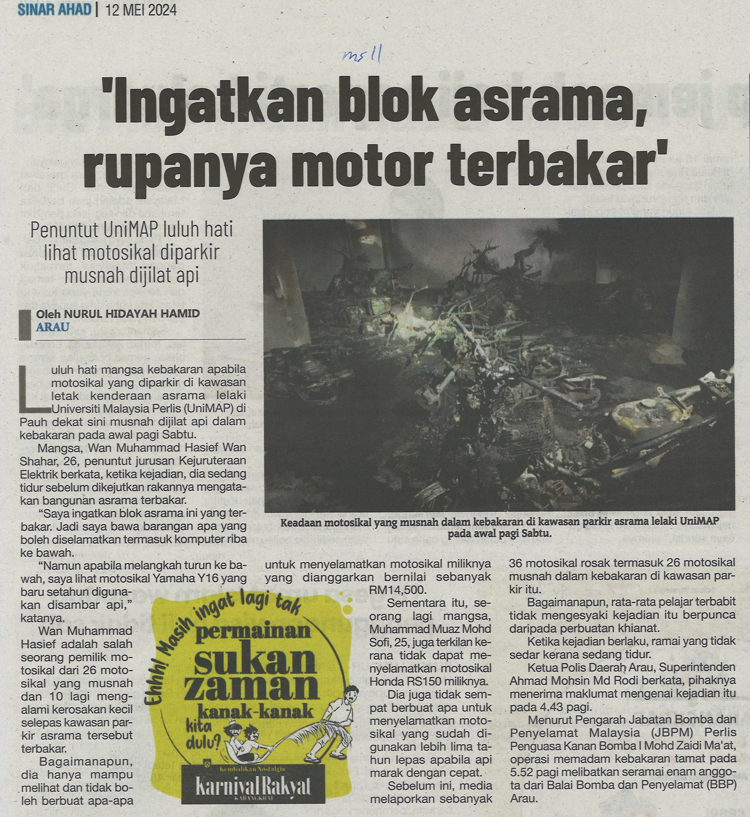 'Ingatkan blok asrama, rupanya motor terbakar'