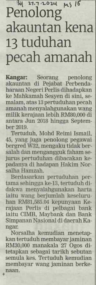 Penolong akauntan kena 13 tuduhan pecah amanah