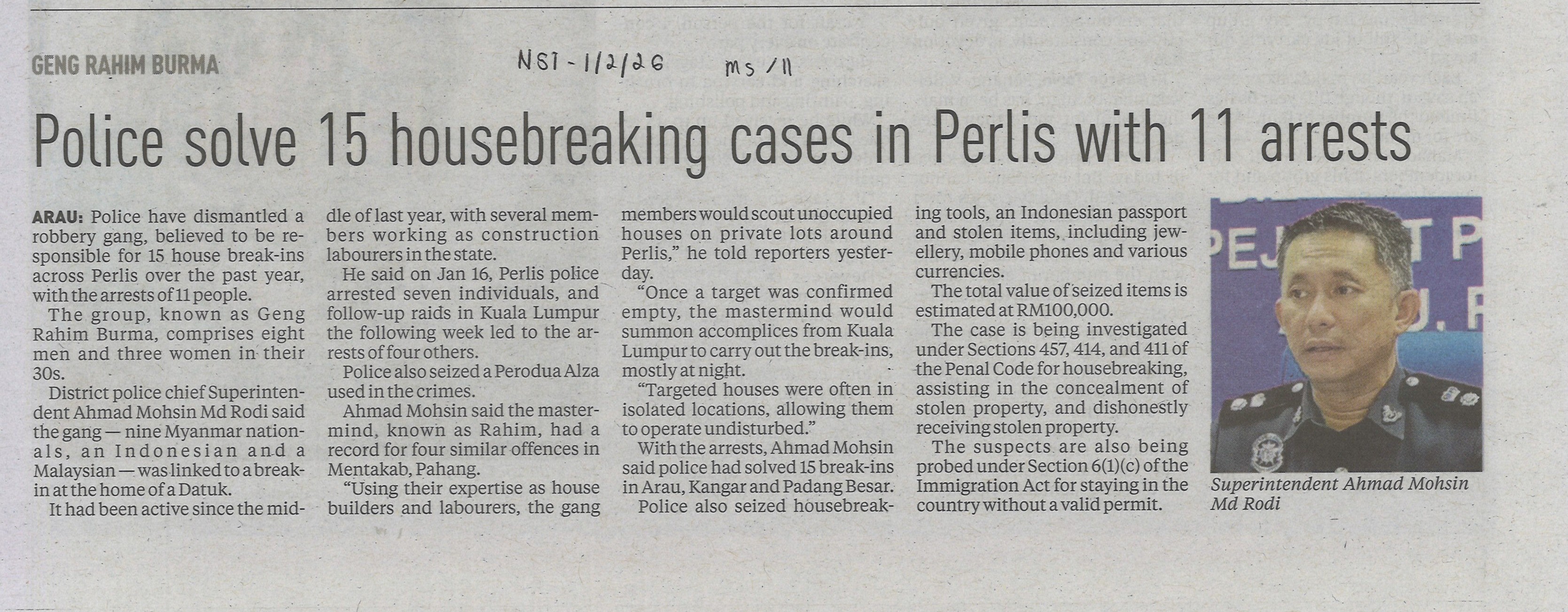 Police solves 15 housebreaking cases in Perlis with 11 arrest