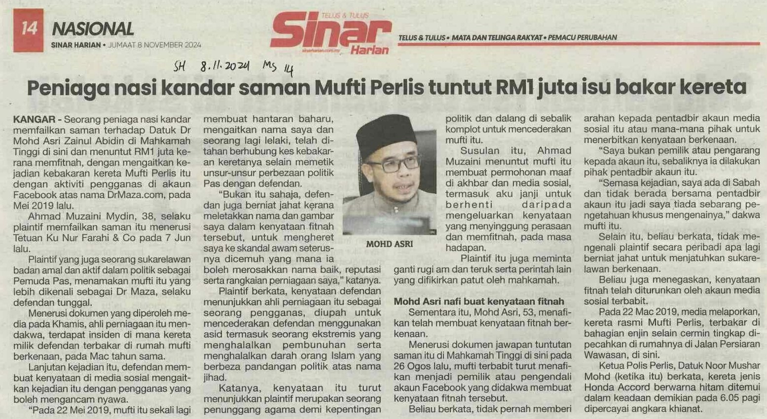 Peniaga nasi kandar saman mufti Perlis tuntut RM 1 juta isu bakar kereta